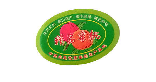 This fruit sticker has traditional Chinese characters and illustrations. The bright pink and orange peaches stand out on the green label. Did you managed to spot the 3 ovals in this fruit sticker?
