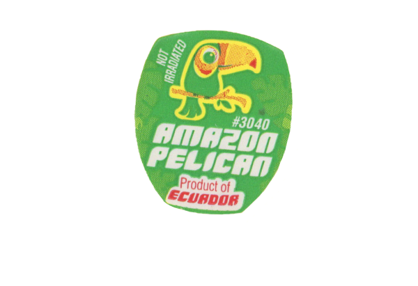 The non-standard-shaped green fruit sticker boldly labelled its country of origin with the text ‘Product of Ecuador’. The letter shapes of the words 'amazon pelican' almost resemble the shape of the pelican's beak. The heavy emphasis on the Amazon Pelican against the green background implies that the brand is friendly towards the Amazon wildlife to garner consumer support.