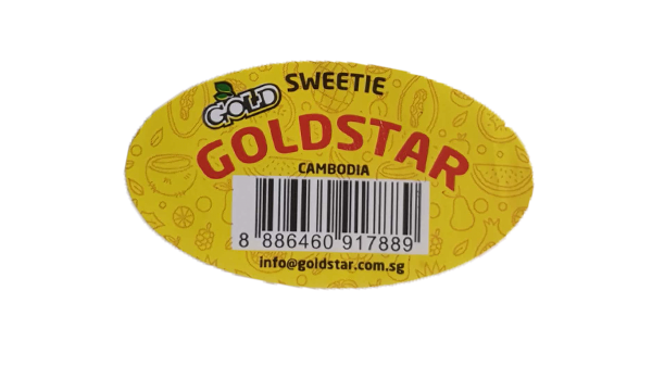 A simple fruit sticker with a yellow background filled with fruit illustrations. A geometric san serif typeface in red with a bar code, website link and country of origin.