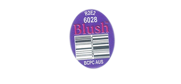 A simple purple fruit sticker with a pink thin serif typeface and no illustrations.