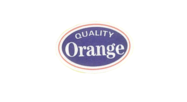 A minimal and stylish fruit sticker with an orange outline and blue fill. The text ‘orange’ uses a bold modern serif while the text ‘quality’ is in all capital letters and aligned along the shape of the sticker.