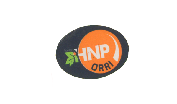 The main visual element in this sticker is an orange circle in the logo which represent the fruit this sticker was stuck on. The green leaves on the left side is mixed with the letter ‘H’ of the logo.