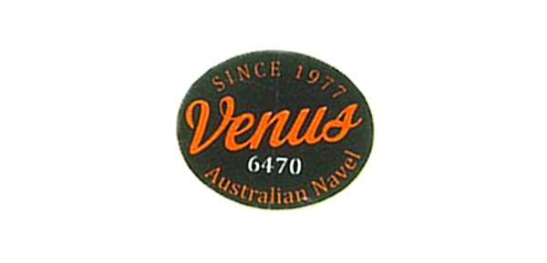 A stylish black and orange fruit sticker with a mix of script and serif typefaces.