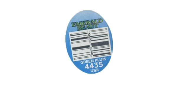 Blue-gradient and plum fruit stickers are uncommon. The tight kerning of the green serif typeface makes it hard to read, even with the drop shadow.