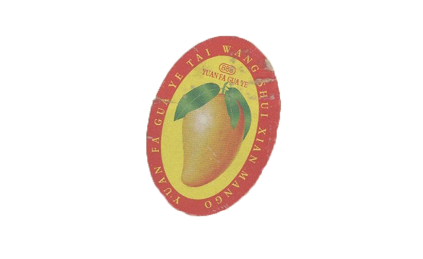 The mango illustration stands out in the oval fruit sticker. The text running along the shape almost resembles embellishments from afar.
