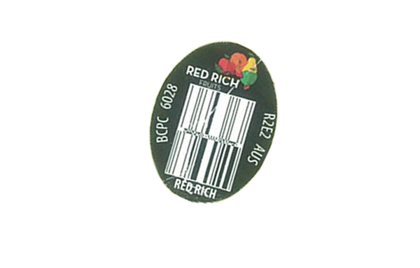 A simple and stylish black fruit sticker with white text, bar code and colourful fruit illustrations.