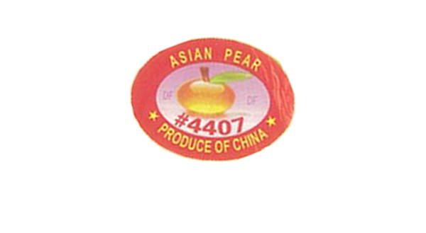 A fruit sticker with thick red outline, star illustrations, tall thin typeface and a PLU code. The letters ‘DF’ beside the fruit are small and thin which might be hard to notice.